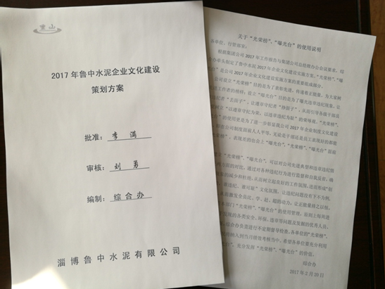 根據(jù)集團(tuán)公司2017年工作報告與集團(tuán)公司總經(jīng)理辦公會議要求,魯中水泥綜合辦組織制定了2017年魯中水泥企業(yè)文化建設(shè)實施方案?!肮鈽s榜”、“曝光臺”作為2017年魯中水泥企業(yè)文化建設(shè)實施方案的重要組成部分,經(jīng)過積極準(zhǔn)備、籌劃,已于2017年2月20日在公司各部門懸掛到位,投入使用。
