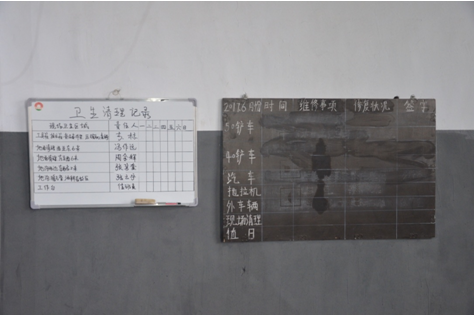 一白一黒兩塊寫字板,分別記錄著車間衛(wèi)生和機(jī)車維護(hù)的記錄。