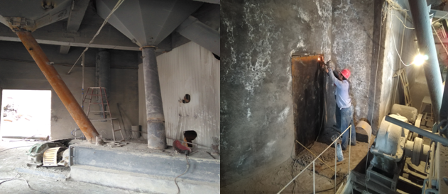 3#包機塵降回料鉸刀拆除和除塵管改造,下導倉處正在密封一個門口