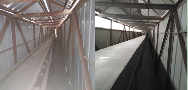 砂巖皮帶技改安裝回料毛刷 ;旋窯車間石粉倉(cāng)下正在安裝皮帶防塵罩