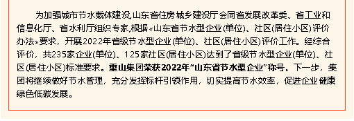 【榮譽】重山集團(tuán)榮獲2022年“山東省節(jié)水型企業(yè)”稱號