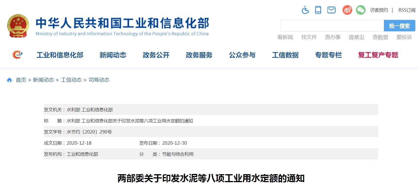 水利部 工業(yè)和信息化部關(guān)于印發(fā)水泥等八項(xiàng)工業(yè)用水定額的通知