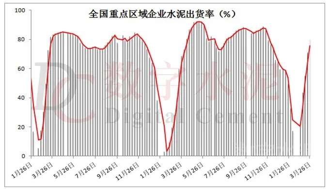 三月下旬,隨著天氣好轉(zhuǎn),建筑工程和攪拌站開(kāi)工率明顯提升,水泥需求也得以迅速恢復(fù)。據(jù)數(shù)字水泥網(wǎng)監(jiān)測(cè)出貨率數(shù)據(jù)顯示,本周全國(guó)重點(diǎn)區(qū)域水泥企業(yè)平均出貨率為81%,環(huán)比增加10個(gè)百分點(diǎn)。分區(qū)域看,華東、華南地區(qū)需求恢復(fù)較好,企業(yè)出貨率均達(dá)到九成以上或正常水平,個(gè)別區(qū)域?qū)崿F(xiàn)銷大于產(chǎn);華北、華中和西南地區(qū)下游需求保持穩(wěn)步回升,出貨率分別為76%、84%和85%,環(huán)比前期增加5%-10%;東北和西北地區(qū)受制于天氣因素,下游需求整體恢復(fù)略顯靠后,本周平均出貨率為40%和64%。