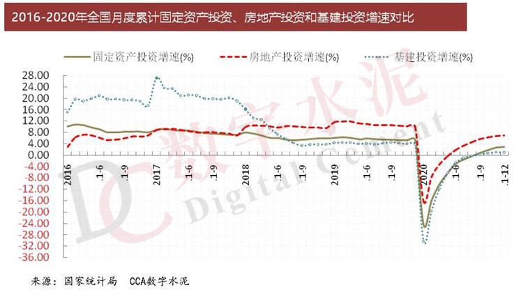 年初以來,面對新冠肺炎疫情的巨大沖擊和復(fù)雜的國內(nèi)外社會環(huán)境。為抑制經(jīng)濟(jì)下行,我國繼續(xù)加強(qiáng)宏觀政策逆周期調(diào)節(jié)力度,加快“六保”“六穩(wěn)”政策落地,落實(shí)各項(xiàng)重大改革舉措,充分發(fā)揮中國超大規(guī)模市場優(yōu)勢和內(nèi)需潛力,構(gòu)建國內(nèi)循環(huán)為主、國內(nèi)國際雙循環(huán)相互促進(jìn)的新發(fā)展格局,多措并舉鞏固經(jīng)濟(jì)復(fù)蘇向好態(tài)勢。積極的財(cái)政政策和穩(wěn)健的貨幣政策持續(xù)顯效發(fā)力,克服了疫情和汛情的不利影響,分階段、有節(jié)奏、有針對性地推出一系列政策舉措,經(jīng)濟(jì)快速回暖。尤其是水泥相關(guān)的固定資產(chǎn)投資、房地產(chǎn)投資、基建投資指標(biāo)快速回升明顯,使得2020年全年我國水泥需求總量未受影響,繼續(xù)保持在23~24億噸的高位平臺期。