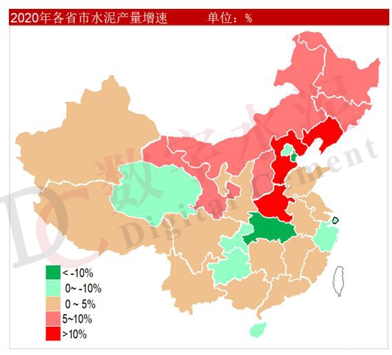 分區(qū)域看,2020年全國六大區(qū)域市場中,北方區(qū)域累計(jì)水泥產(chǎn)量同比增速持續(xù)提升且快于南部區(qū)域。其中,華北和東北保持高位增長,除京津地區(qū)外各省份同比均有明顯增長,河北和遼寧增速達(dá)到兩位數(shù)以上;西北地區(qū)總體呈現(xiàn)同比小幅增長,除青海需求大幅下降外,其他省份同比均實(shí)現(xiàn)不同幅度增長。南方區(qū)域中,華東和中南水泥產(chǎn)量年末實(shí)現(xiàn)由負(fù)轉(zhuǎn)正,但長三角地區(qū)較去年同期仍有小幅下降;西南地區(qū)累計(jì)水泥產(chǎn)量同比仍略有下降,降幅持續(xù)收窄至不足1%。
