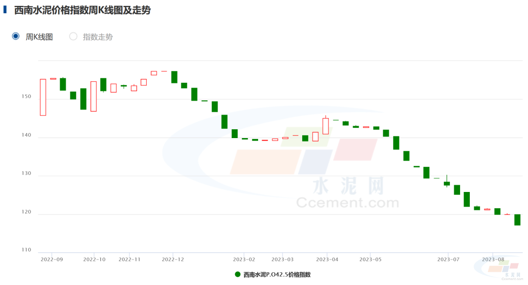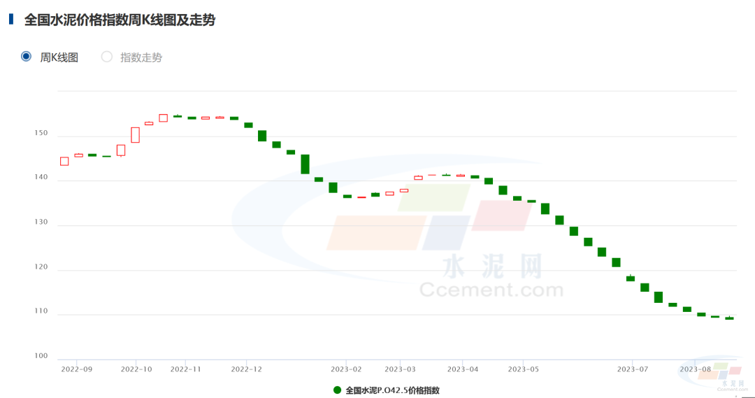 上周五,全國水泥價格指數(shù)(CEMPI)報收109.09點,環(huán)比下跌0.32%,同比下跌23.5%。