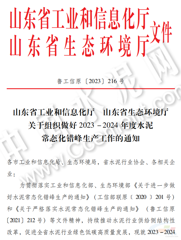 近日,山東省發(fā)布了《關(guān)于組織做好2023-2024年度水泥常態(tài)化錯峰生產(chǎn)工作的通知》。