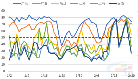 春節(jié)期間,多數(shù)地區(qū)放假停工,水泥企業(yè)進(jìn)行錯(cuò)峰或檢修停產(chǎn),供應(yīng)出現(xiàn)下滑,庫存保持相對(duì)低位運(yùn)行,節(jié)后庫存壓力下降,企業(yè)漲價(jià)意愿強(qiáng)烈,華東、華南部分水泥大省開始零星調(diào)漲水泥價(jià)格。