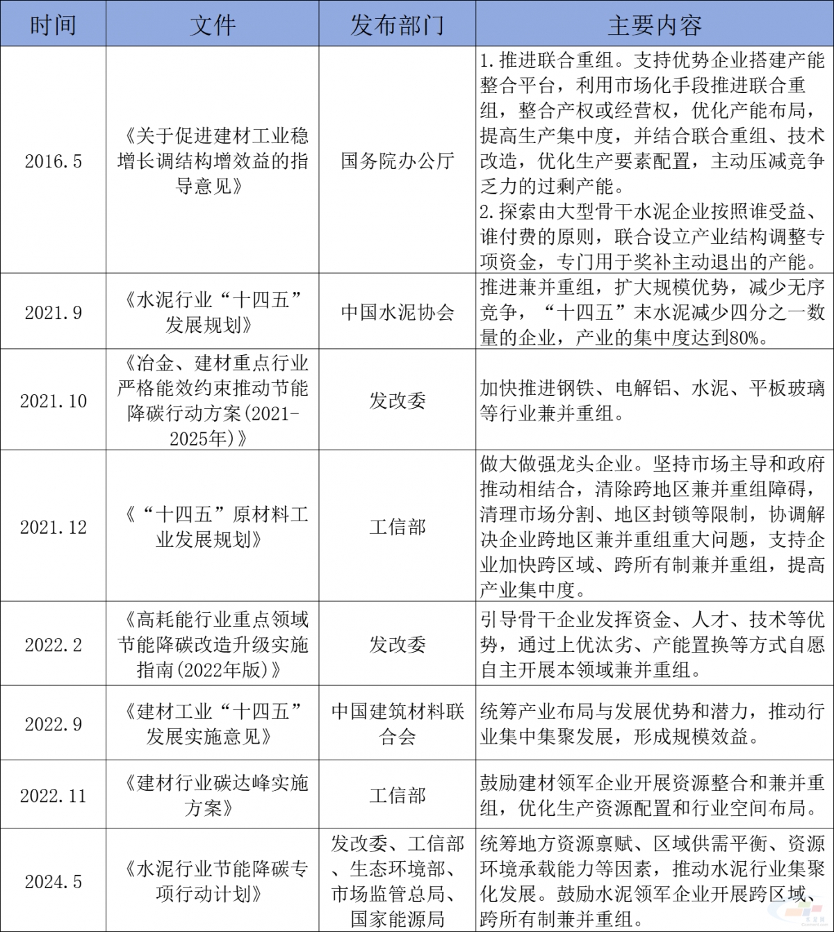 盡管挑戰(zhàn)重重,但越來越多的水泥企業(yè)認為,推進并購重組,不斷提升集中度儼然成為行業(yè)走出當前困境的重要舉措。近年出臺的各項政策文件也反復強調,要鼓勵水泥領軍企業(yè)開展跨區(qū)域、跨所有制兼并重組。