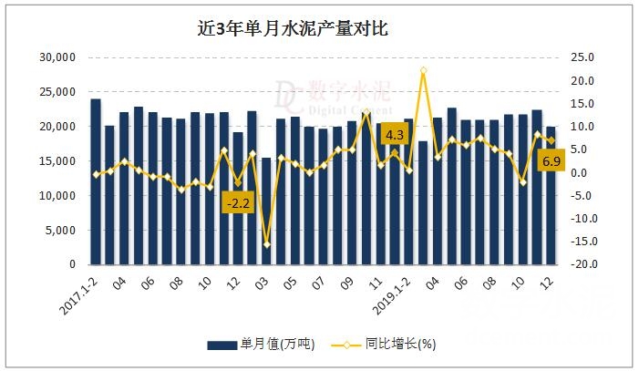 2019,全國累計水泥產(chǎn)量23.3億噸,同比增長6.1%,增速較去年同期提高3.1個百分點,與1-11月增速持平。201912月,全國單月水泥產(chǎn)量1.99億噸,同比增長6.9%,增速較去年同期提高2.6個百分點,環(huán)比下降11.35%。