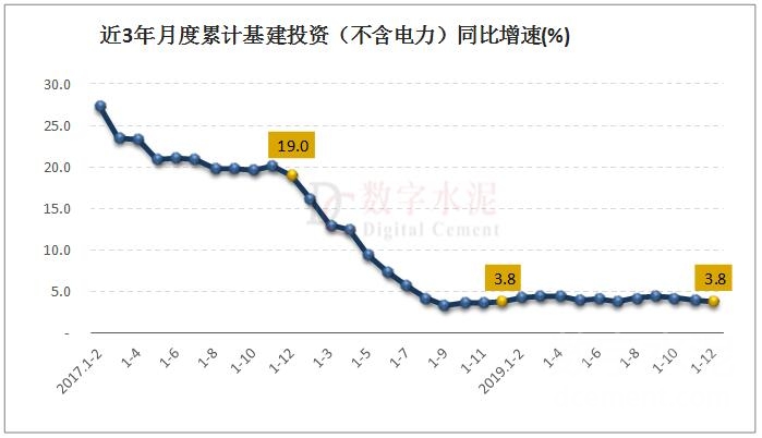 2019,全國基礎設施投資(不含電力)同比增長3.8 %,增速較1-11月回落0.2個百分點,與去年同期增速持平。其中,鐵路運輸業(yè)投資下降0.1%,1-11月份為增長1.6%;道路運輸業(yè)投資增長9.0%,增速較1-11月加快0.2個百分點;水利管理業(yè)投資增長1.4%,增速較1-11月回落0.3個百分點。