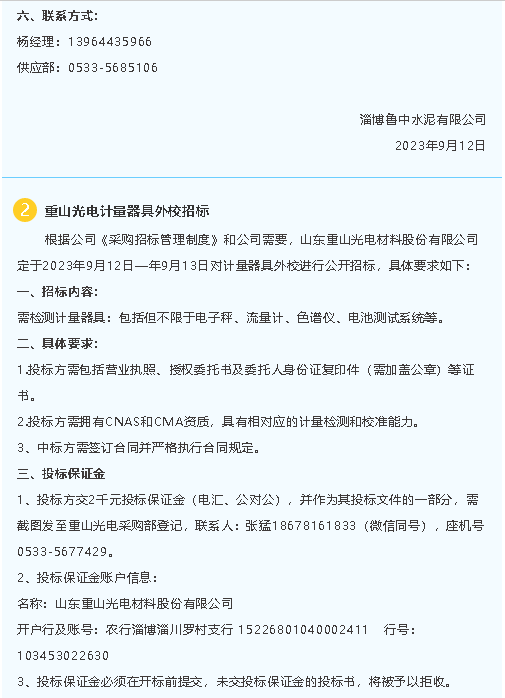 【招標(biāo)公告】魯中水泥、重山光電