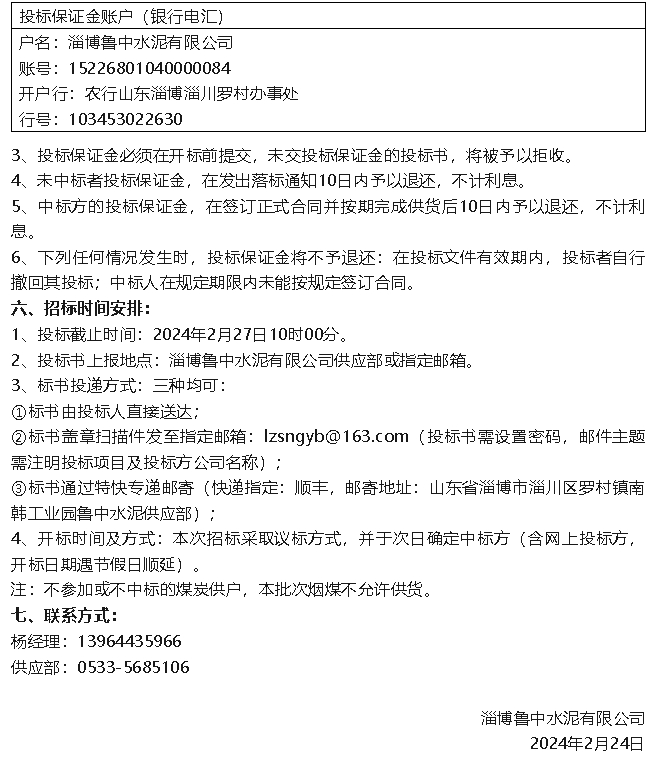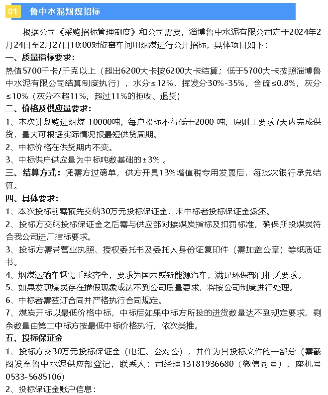 【招標(biāo)公告】魯中水泥煙煤、水渣招標(biāo)