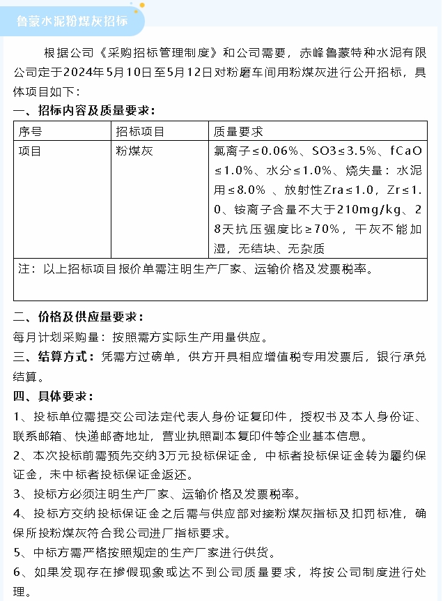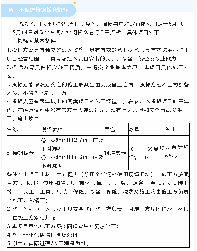 【招標(biāo)公告】魯蒙水泥粉煤灰、魯中水泥煙煤及焊接鋼板倉(cāng)招標(biāo)