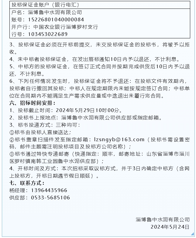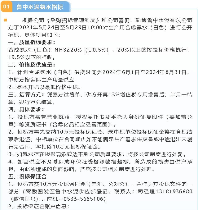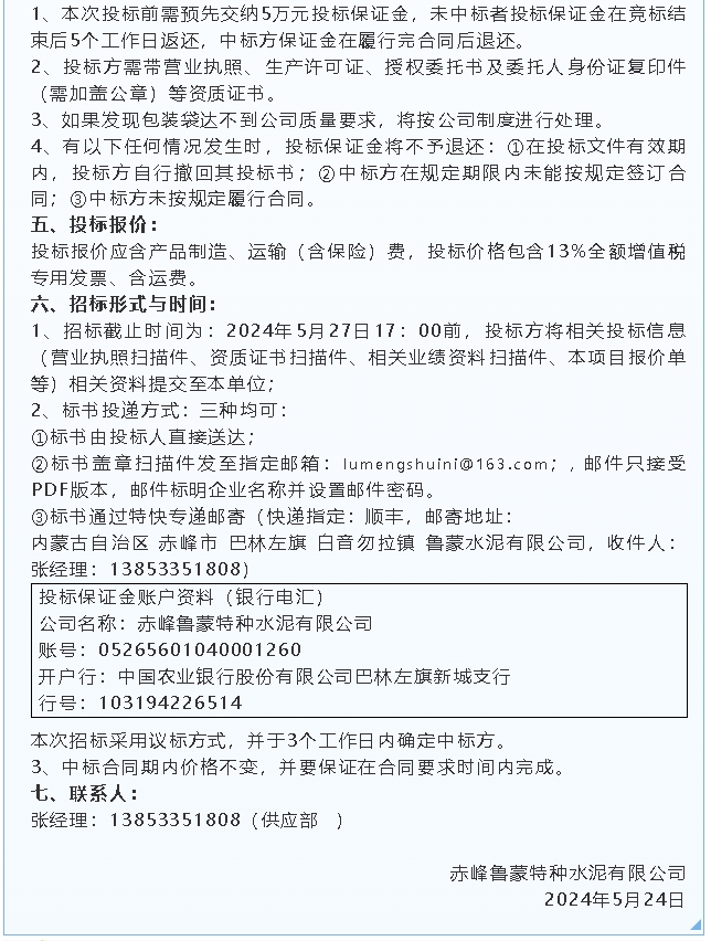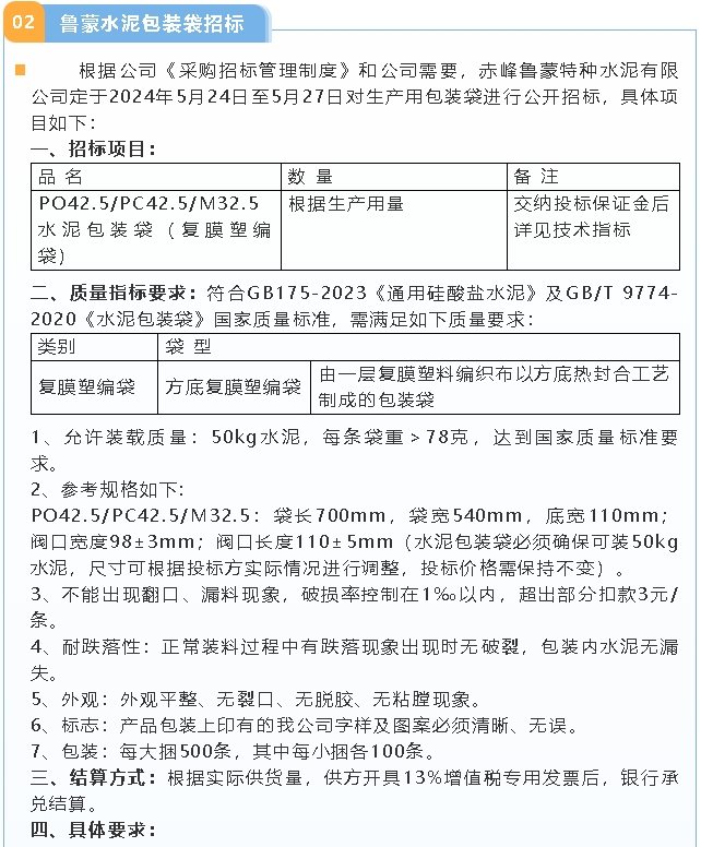 【招標公告】魯中水泥氨水、魯蒙水泥包裝袋招標