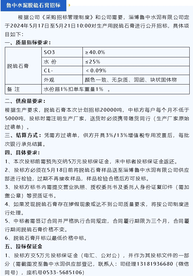 【招標(biāo)公告】魯蒙水泥燃煤爐渣,魯中水泥粉煤灰、脫硫石膏招標(biāo)