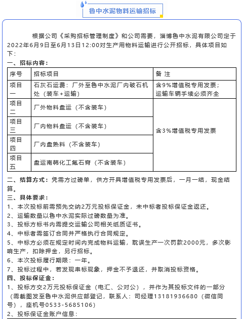 【招標(biāo)公告】魯中水泥氟石膏、物料運(yùn)輸招標(biāo)
