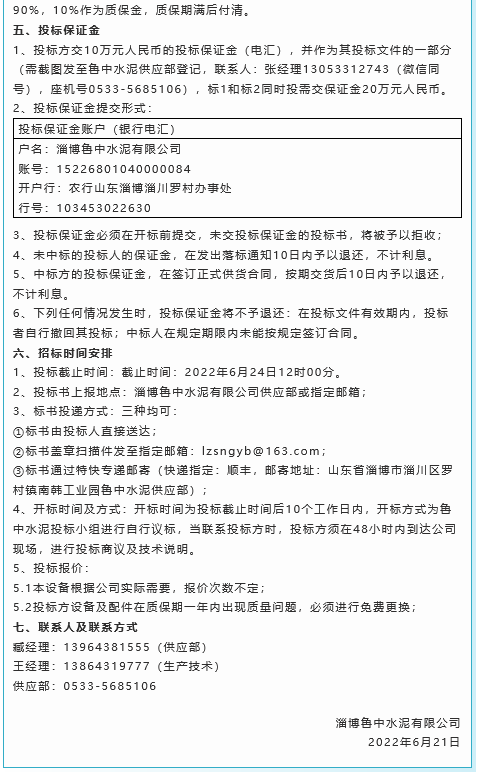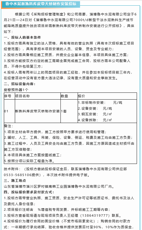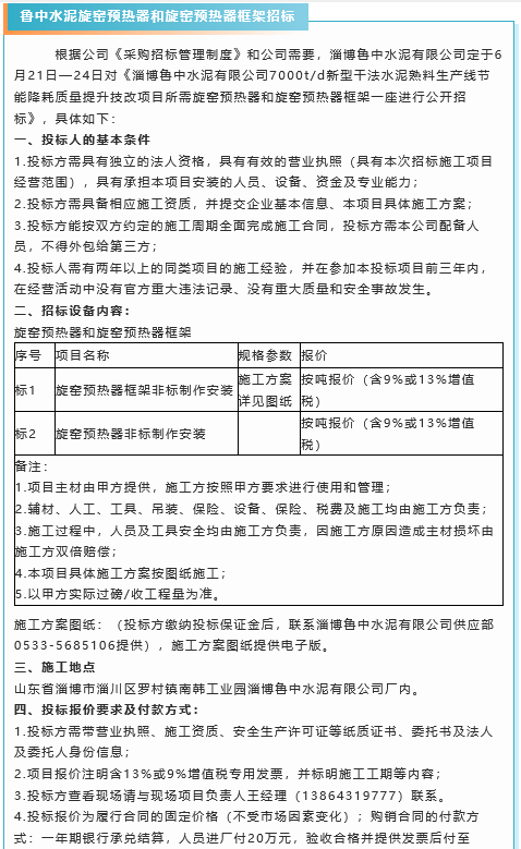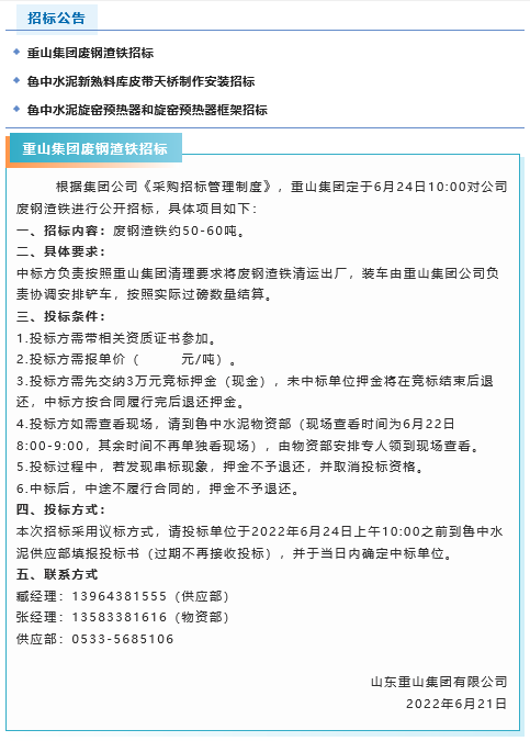 【招標公告】重山集團廢鋼渣鐵、魯中水泥新熟料庫皮帶天橋制作安裝、旋窯預熱器和旋窯預熱器框架招標