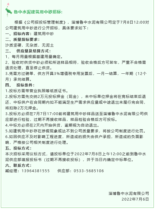 【招標(biāo)公告】魯中水泥氨水、建筑用中砂招標(biāo)