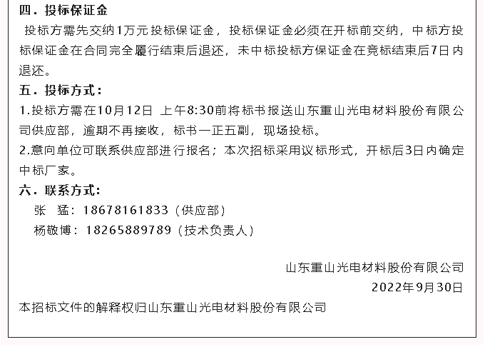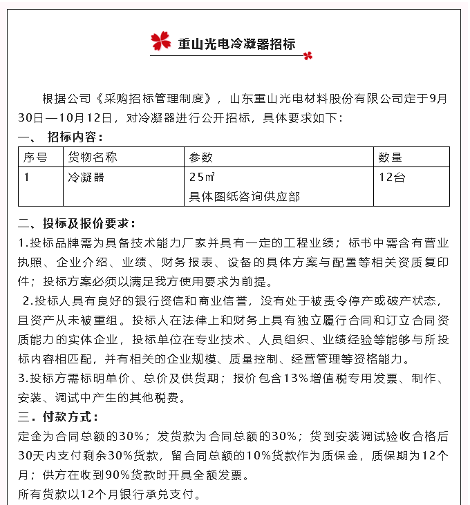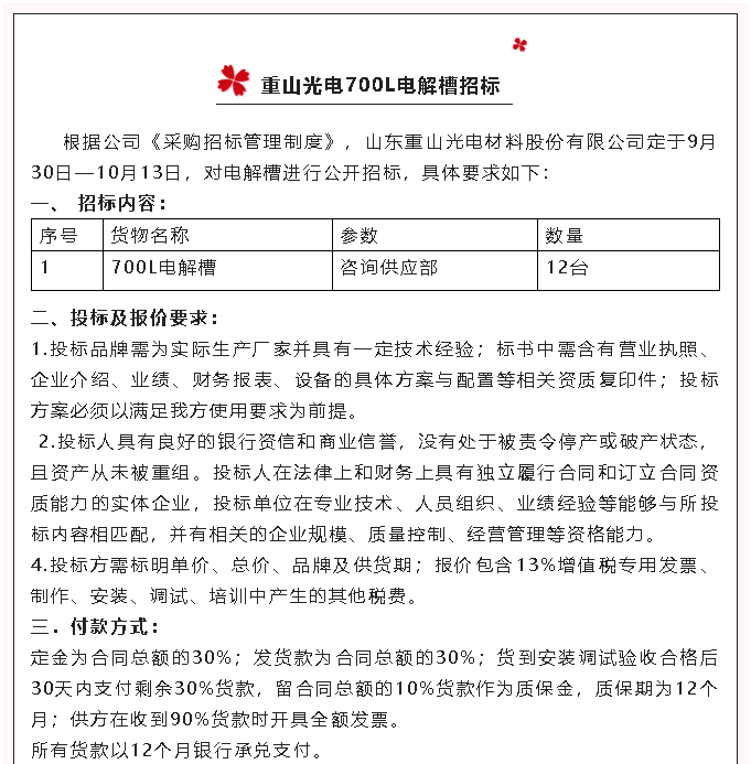 【招標(biāo)公告】重山光電700L電解槽、車(chē)間改造、冷凝器招標(biāo)
