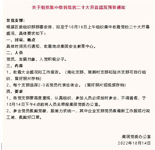 【黨建】關(guān)于組織集中收看黨的二十大開幕盛況預(yù)備通知